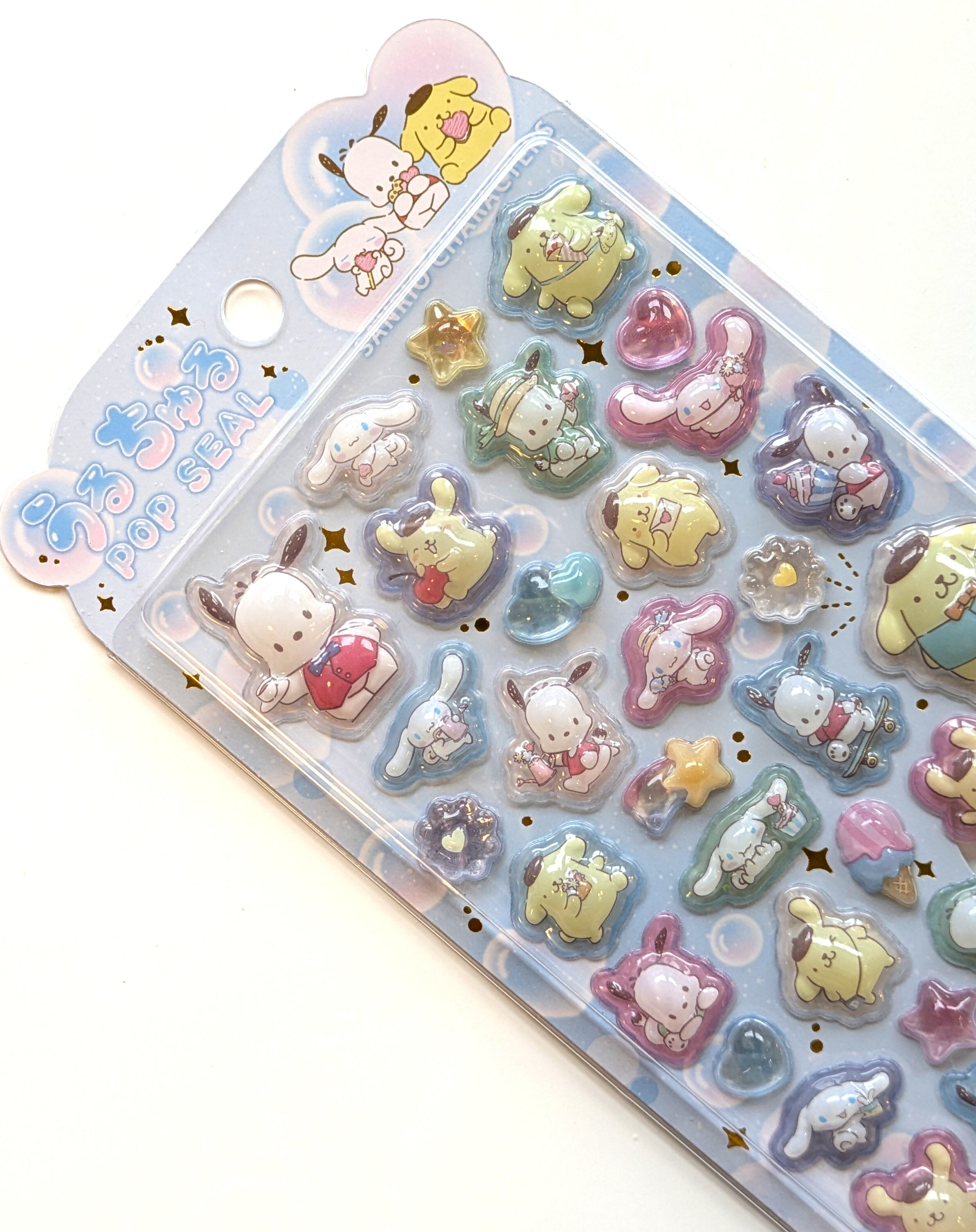 サンリオキャラクターズの人気「うるちゅるPOPシール」と、ポチャッコのおはじきシールフレークの2点セットです。