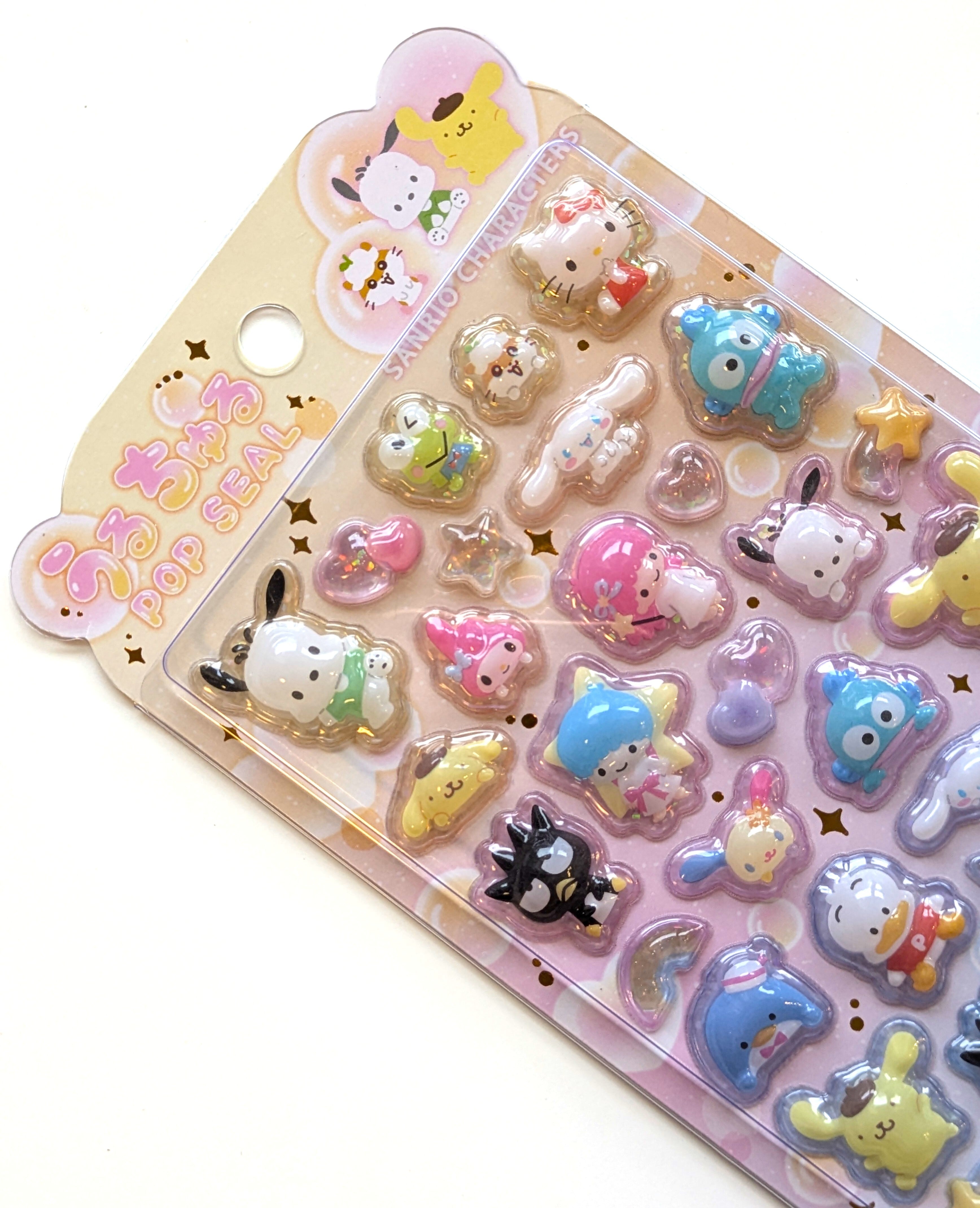 サンリオキャラクターズの人気シリーズうるちゅるPOPシールと、はんぎょどんのおはじきシールフレークの2点セットです。